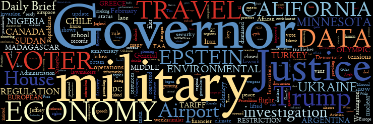 MIDDLE EAST | UKRAINE | El PASO | MINNESOTA | U.S. GOVERNORS | EPA | U.S. TARIFFS | U.S. MILITARY | U.S. JUSTICE DEPARTMENT | U.S. VOTER DATA | U.S. ECONOMY | MORE U.S. ECONOMY | CALIFORNIA | NIGERIA | CANADA | SOUTH SUDAN | GREECE AND TURKEY | CHILE | ARGENTINA | MADAGASCAR | MORE...