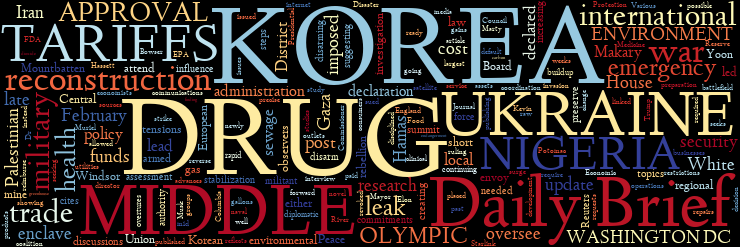 MIDDLE EAST | UKRAINE | U.S. TARIFFS | U.S. DRUG APPROVALS | WASHINGTON, DC | U.S. ENVIRONMENT | SOUTH KOREA | NORTH KOREA | U.K. | NIGERIA | OLYMPICS | TODAY IN HISTORY
