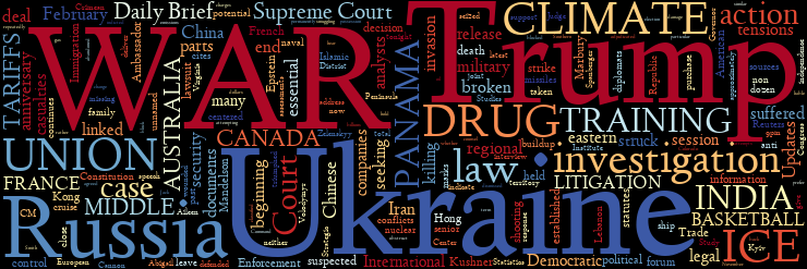 MIDDLE EAST | UKRAINE | U.S. STATE OF THE UNION | TRUMP INVESTIGATIONS | CLIMATE LITIGATION | U.S. DRUG WAR | ICE TRAINING | U.S. TARIFFS | U.S. AND FRANCE | PANAMA | U.K. | AUSTRALIA | INDIA | RUSSIA | CANADA | BASKETBALL | TODAY IN HISTORY