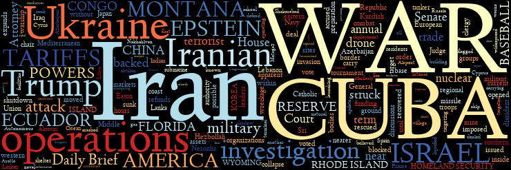 U.S., ISRAEL, IRAN WAR | UKRAINE | U.S. WAR POWERS | U.S. TARIFFS | FLORIDA | WYOMING | RHODE ISLAND | U.S. DEPARTMENT OF HOMELAND SECURITY | MONTANA | EPSTEIN INVESTIGATIONS | U.S. FEDERAL RESERVE | E.U. AND SOUTH AMERICA | ECUADOR AND CUBA | CONGO | CUBA | SOUTH KOREA | CHINA