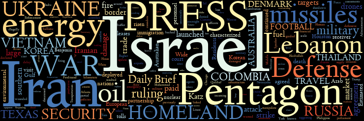 U.S., ISRAEL, IRAN WAR | UKRAINE | U.S. TRAVEL | U.S. PENTAGON PRESS | U.S. HOMELAND SECURITY | TEXAS | U.S. ENERGY | COLOMBIA | DENMARK | E.U. AND AUSTRALIA | THAILAND | NORTH KOREA | VIETNAM AND RUSSIA | FOOTBALL | TODAY IN HISTORY