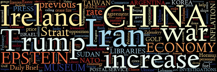 U.S., ISRAEL, IRAN WAR | U.S. INFLATION | U.S. PRESS | EPSTEIN INVESTIGATIONS | U.S. POSTAL SERVICE | U.S. ECONOMY | U.S. LIBRARIES AND MUSEUMS | U.S. AND NATO | CHINA AND TAIWAN | SUDAN | ARGENTINA | NORTH KOREA AND CHINA | IRELAND | SPACE | GOLF | TODAY IN HISTORY