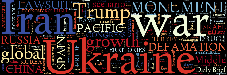 U.S., ISRAEL, IRAN WAR | UKRAINE | U.S. CONGRESS | U.S. DRUG WAR | U.S. PRIDE MONUMENT | TRUMP DEFAMATION LAWSUIT | U.S. PACIFIC TERRITORIES | GLOBAL ECONOMY | TURKEY | CANADA | CHINA | NORTH KOREA | SPAIN | RUSSIA | BASKETBALL | ROCK & ROLL HALL OF FAME | R.I.P. | TODAY IN HISTORY