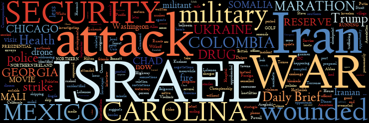 U.S., ISRAEL, IRAN WAR | UKRAINE | U.S. PRESIDENTIAL SECURITY | U.S. DRUG WAR | GEORGIA | CHICAGO | U.S. FEDERAL RESERVE | SOUTH CAROLINA | U.S. AND U.K. | U.S. AND MEXICO | COLOMBIA | MALI | NORTHERN IRELAND | ISRAEL | CHAD | SOMALIA | MARATHON RUNNING | GOLF | WEEKEND MOVIES | TODAY IN HISTORY
