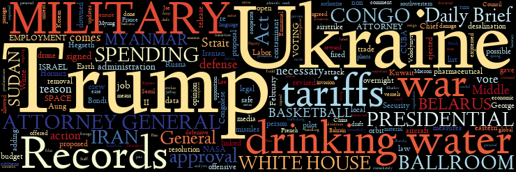 U.S., ISRAEL, IRAN WAR | UKRAINE | U.S. MILITARY | U.S. ATTORNEY GENERAL | U.S. TARIFFS | U.S. DRINKING WATER | U.S. MILITARY SPENDING | U.S. EMPLOYMENT | U.S. VOTING | U.S. PRESIDENTIAL RECORDS | WHITE HOUSE BALLROOM | CONGO | MORE CONGO | BELARUS | CUBA | MYANMAR | SUDAN | SPACE