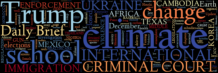 MIDDLE EAST | UKRAINE | U.S. GUN VIOLENCE | U.S. HEALTHCARE LEGISLATION | U.S. IMMIGRATION ENFORCEMENT | U.S. CLIMATE | TEXAS | U.S. AND MEXICO | INTERNATIONAL CRIMINAL COURT | CAMBODIA AND THAILAND | WEST AFRICA | NIGERIA | E.U. TECH REGULATION | SOUTH KOREA | MOROCCO | BASEBALL | TODAY IN HISTORY