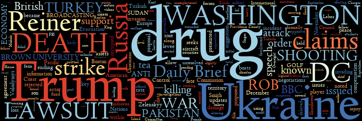 UKRAINE | U.S. ECONOMY | U.S. ANTI-DRUG STRIKES | WASHINGTON | BROWN UNIVERSITY SHOOTING | ROB REINER DEATH | WASHINGTON, DC | U.S. DRUG WAR | TRUMP BROADCASTING LAWSUIT | U.S. AND U.K. | U.K. AND RUSSIA | TURKEY | PAKISTAN | SOUTH SUDAN | GOLF | R.I.P. | TODAY IN HISTORY