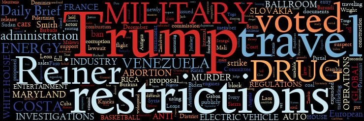 U.S. TRAVEL RESTRICTIONS | TRUMP INVESTIGATIONS | MARYLAND | WHITE HOUSE BALLROOM | U.S. MILITARY ANTI-DRUG OPERATIONS | U.S. ELECTRIC VEHICLES | REINER MURDERS | U.S. AND VENEZUELA | GLOBAL ENERGY | SLOVAKIA | ABORTION | FRANCE | E.U. AUTO REGULATIONS | COSTA RICA | ENTERTAINMENT INDUSTRY | MORE...