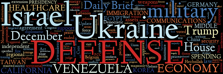 MIDDLE EAST | UKRAINE | U.S. ECONOMY | U.S. PRESIDENCY | U.S. HEALTHCARE | CALIFORNIA | U.S. FEDERAL COMMUNICATIONS | U.S. IMMIGRATION | U.S. DEFENSE SPENDING | U.S. AND VENEZUELA | U.S. AND TAIWAN | GERMANY | ISRAEL AND EGYPT | SOUTH KOREA | TODAY IN HISTORY