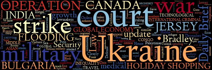 MIDDLE EAST | UKRAINE | U.S. MILITARY OPERATIONS | U.S. AIR TRAVEL | NEW JERSEY | U.S. HOLIDAY SHOPPING | U.S. AND U.K. | GLOBAL ECONOMY | INTERNATIONAL CRIMINAL COURT | CANADA | ASIAN FLOODING | CONGO | INDIA | BULGARIA | TECHNOLOGICAL INEQUALITY | TODAY IN HISTORY