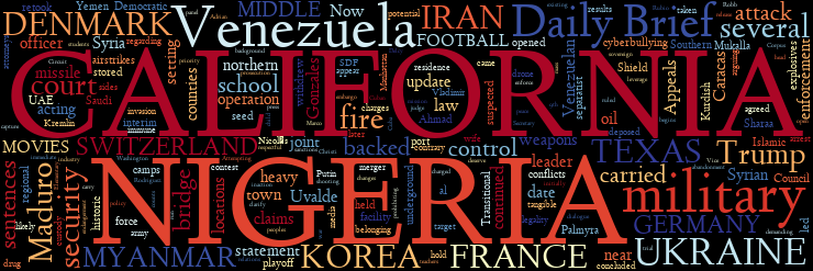 MIDDLE EAST | UKRAINE | U.S. AND VENEZUELA | TEXAS | CALIFORNIA | MORE CALIFORNIA | U.S. AND DENMARK | NORTH KOREA | IRAN | FRANCE | MYANMAR | SWITZERLAND | NIGERIA | MORE NIGERIA | GERMANY | FOOTBALL | WEEKEND MOVIES | TODAY IN HISTORY