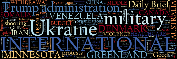 MIDDLE EAST | UKRAINE | MINNESOTA | U.S. GUN VIOLENCE | U.S. INTERNATIONAL WITHDRAWAL | U.S. MILITARY BUDGET | U.S. HEALTHCARE | U.S., DENMARK, AND GREENLAND | U.S. AND VENEZUELA | U.S. AND SOMALIA | AUSTRALIA | CANADA AND CHINA | IRAN | FRANCE | TODAY IN HISTORY