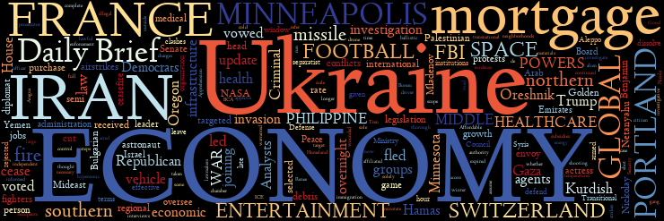 MIDDLE EAST | UKRAINE | MINNEAPOLIS | PORTLAND | U.S. HEALTHCARE | U.S. WAR POWERS | U.S. ECONOMY | U.S. MORTGAGES | GLOBAL ECONOMY | IRAN | PHILIPPINES | U.K. AND FRANCE | SWITZERLAND | SPACE | COLLEGE FOOTBALL | ENTERTAINMENT AWARDS | TODAY IN HISTORY