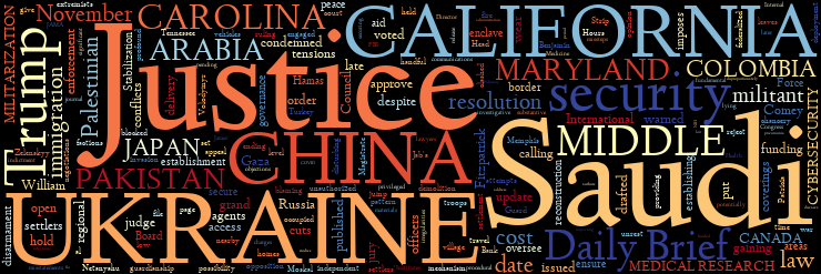 MIDDLE EAST | UKRAINE | U.S. MILITARIZATION | U.S. JUSTICE DEPARTMENT | U.S. MEDICAL RESEARCH | CALIFORNIA | NORTH CAROLINA | MARYLAND | U.S. AND SAUDI ARABIA | PAKISTAN | CANADA | COLOMBIA | JAPAN AND CHINA | CYBERSECURITY | TODAY IN HISTORY