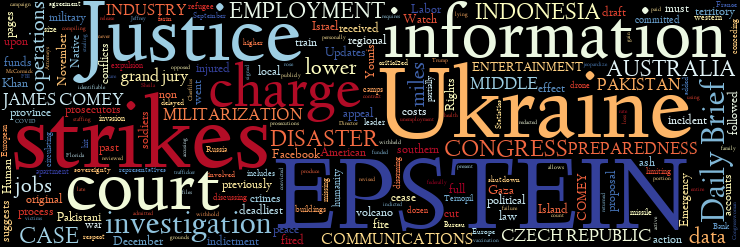 MIDDLE EAST | UKRAINE | U.S. EMPLOYMENT | U.S. EPSTEIN INVESTIGATIONS | U.S. CONGRESS | U.S. JAMES COMEY CASE | U.S. DISASTER PREPAREDNESS | U.S. MILITARIZATION | INDONESIA | AUSTRALIA | CZECH REPUBLIC | PAKISTAN | COMMUNICATIONS INDUSTRY | ENTERTAINMENT AWARDS | TODAY IN HISTORY