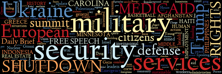MIDDLE EAST | UKRAINE | U.S. GOVERNMENT SHUTDOWN | U.S. MILITARY | U.S. FREE SPEECH | U.S. REAL ESTATE | U.S. EMPLOYMENT | U.S. MEDICAID | NORTH CAROLINA | MINNESOTA | HAITI | EUROPEAN SECURITY | PHILIPPINES | GREECE | INDONESIA | AFGHANISTAN | HUMAN RIGHTS AWARDS | BASKETBALL | TODAY IN HISTORY
