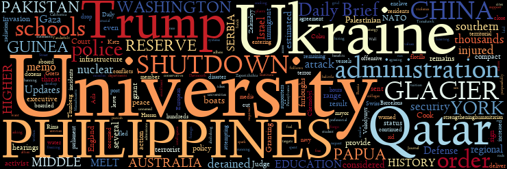 MIDDLE EAST | UKRAINE | U.S. HIGHER EDUCATION | U.S. AND QATAR | U.S. GOVERNMENT SHUTDOWN | NEW YORK | WASHINGTON | U.S. FEDERAL RESERVE | U.K. | SERBIA | PHILIPPINES AND CHINA | PAKISTAN | GLACIER MELT | PHILIPPINES | PAPUA NEW GUINEA AND AUSTRALIA | R.I.P. | TODAY IN HISTORY