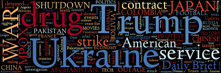 MIDDLE EAST | UKRAINE | U.S. DRUG WAR | U.S. PROTESTS | U.S. MPOX | U.S. GOVERNMENT SHUTDOWN | U.S. POLITICS | U.S. AND COLOMBIA | AFGHANISTAN AND PAKISTAN | FRANCE | E.U. AND RUSSIA | CHINA | CHINESE ECONOMY | BOLIVIA | JAPAN | U.K. | TECH OUTAGE | BASEBALL | COLLEGE FOOTBALL