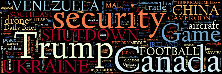 MIDDLE EAST | UKRAINE | U.S. GOVERNMENT SHUTDOWN | U.S. MILITARY | U.S. SOCIAL SECURITY | U.S. POLITICS | U.S. AND VENEZUELA | U.S. AND CANADA | U.S. AND CHINA | U.S. AND JAPAN | HURRICANE MELISSA | SOUTHEAST ASIA | FRANCE | CAMEROON | MALI | IRELAND | BASEBALL | COLLEGE FOOTBALL