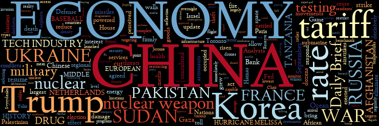 MIDDLE EAST | UKRAINE | U.S. NUCLEAR WEAPONS | U.S. ECONOMY | U.S. DRUG WAR | U.S. TARIFFS | U.S. AND CHINA | U.S. AND SOUTH KOREA | SUDAN | HURRICANE MELISSA | RUSSIA | AFGHANISTAN AND PAKISTAN | FRANCE | EUROPEAN ECONOMY | CHINA | TANZANIA | NETHERLANDS | TECH INDUSTRY | MORE...