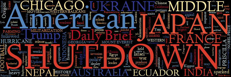 MIDDLE EAST | UKRAINE | U.S. MILITARIZATION | CHICAGO | U.S. GOVERNMENT SHUTDOWN | MORE U.S. GOVERNMENT SHUTDOWN | U.S. FARMING | NOBEL PRIZES | FRANCE | JAPAN | AUSTRALIA | NEPAL AND INDIA | ECUADOR | U.K. | WESTERN BALKANS | HURRICANE PRISCILLA | GEORGIA | INDONESIA | MOUNT EVEREST