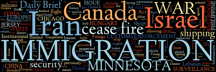 U.S., ISRAEL, IRAN WAR | U.S. SURVEILLANCE | IMMIGRATION AND CUSTOMS ENFORCEMENT | MINNESOTA | NEW JERSEY | CHICAGO | WHITE HOUSE BALLROOM | U.S. AND CHINA | U.S. AND EUROPE | HUNGARY | SYRIA | CANADA | PHILIPPINES | U.K. | TODAY IN HISTORY