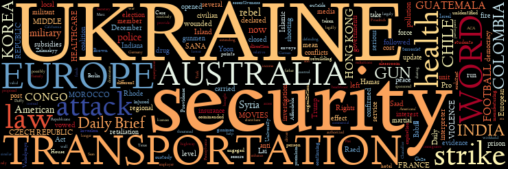 MIDDLE EAST | UKRAINE | U.S. GUN VIOLENCE | U.S. HEALTHCARE | U.S. TRANSPORTATION | U.S. AND EUROPE | AUSTRALIA | COLOMBIA | HONG KONG | INDIA | CZECH REPUBLIC | CHILE | SOUTH KOREA | GUATEMALA | MOROCCO | CONGO | FRANCE | COLLEGE FOOTBALL