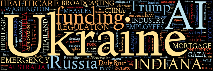 UKRAINE | U.S. FEDERAL EMPLOYEES | U.S. MORTGAGES | INDIANA | WASHINGTON | U.S. HEALTHCARE | U.S. MEASLES | U.S. EMERGENCY FUNDING | U.S. EMPLOYMENT | U.S. PUBLIC BROADCASTING | U.S. AND VENEZUELA | GAZA | BULGARIA | CHINA | PHILIPPINES | GERMANY | RUSSIA | THAILAND | IRAN | AUSTRALIA | AI |