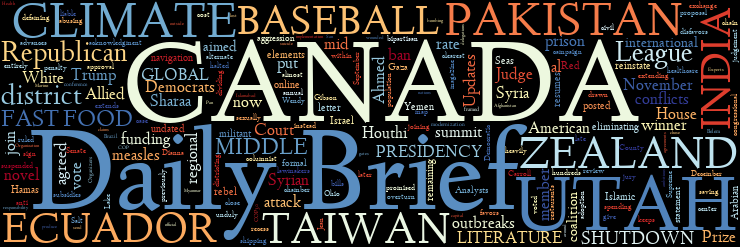 MIDDLE EAST | U.S. GOVERNMENT SHUTDOWN | U.S. PRESIDENCY | UTAH | U.S. FAST FOOD | GLOBAL CLIMATE | PAKISTAN | CANADA | NEW ZEALAND | TAIWAN | ECUADOR | INDIA | LITERATURE | BASEBALL | TODAY IN HISTORY