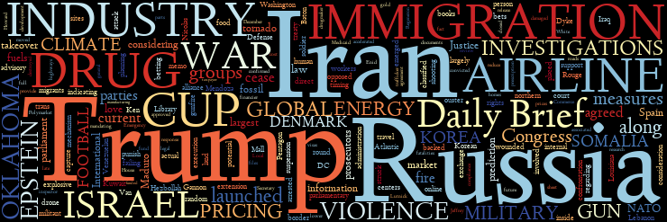 U.S., ISRAEL, IRAN WAR | U.S. GUN VIOLENCE | U.S. MILITARY | OKLAHOMA | EPSTEIN INVESTIGATIONS | U.S. IMMIGRATION | U.S. DRUG PRICING | U.S. AIRLINE INDUSTRY | GLOBAL ENERGY AND CLIMATE | RUSSIA | SOMALIA | KOREA | DENMARK | TECH INDUSTRY | FOOTBALL | WORLD CUP | TODAY IN HISTORY