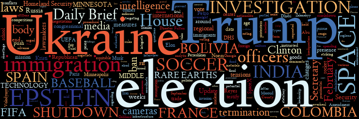MIDDLE EAST | UKRAINE | U.S. GOVERNMENT SHUTDOWN | U.S. ELECTIONS | MORE U.S. ELECTIONS | MINNESOTA | U.S. IMMIGRATION | EPSTEIN INVESTIGATION | U.S. RARE EARTHS | U.S. AND INDIA | U.S. AND COLOMBIA | FRANCE | BOLIVIA | SPAIN | SPACE AND TECHNOLOGY | MORE...