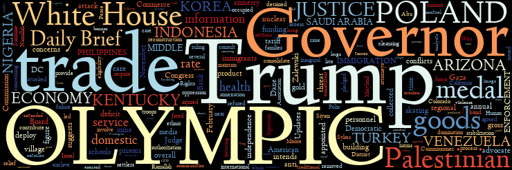 MIDDLE EAST | UKRAINE | U.S. TARIFFS | U.S. DRUG APPROVALS | WASHINGTON, DC | U.S. ENVIRONMENT | SOUTH KOREA | NORTH KOREA | U.K. | NIGERIA | OLYMPICS | TODAY IN HISTORY