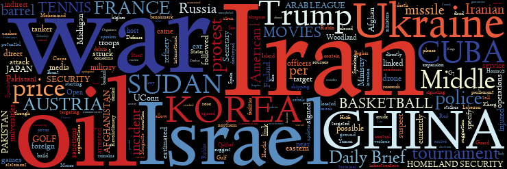 U.S., ISRAEL, IRAN WAR | UKRAINE | U.S. PROTESTS | U.S. DEPARTMENT OF HOMELAND SECURITY | CUBA | ARAB LEAGUE | U.K. | AFGHANISTAN AND PAKISTAN | CHINA AND JAPAN | CHINA AND NORTH KOREA | FRANCE | SUDAN | AUSTRIA | SOUTH KOREA | COLLEGE BASKETBALL | GOLF | TENNIS | WEEKEND MOVIES | TODAY IN HISTORY