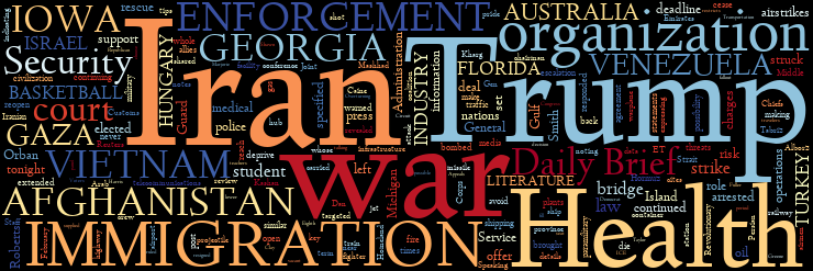 U.S., ISRAEL, IRAN WAR | U.S. IMMIGRATION ENFORCEMENT | GEORGIA | IOWA | FLORIDA | U.S. AND HUNGARY | AFGHANISTAN | VENEZUELA | GAZA | U.K. | TURKEY | VIETNAM | AUSTRALIA | NEWS INDUSTRY | COLLEGE BASKETBALL | LITERATURE AWARDS | TODAY IN HISTORY